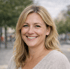 Eine lächelnde Frau mit blonden Haaren und blauem Pullover sitzt in einem Zimmer mit Treppe im Hintergrund.